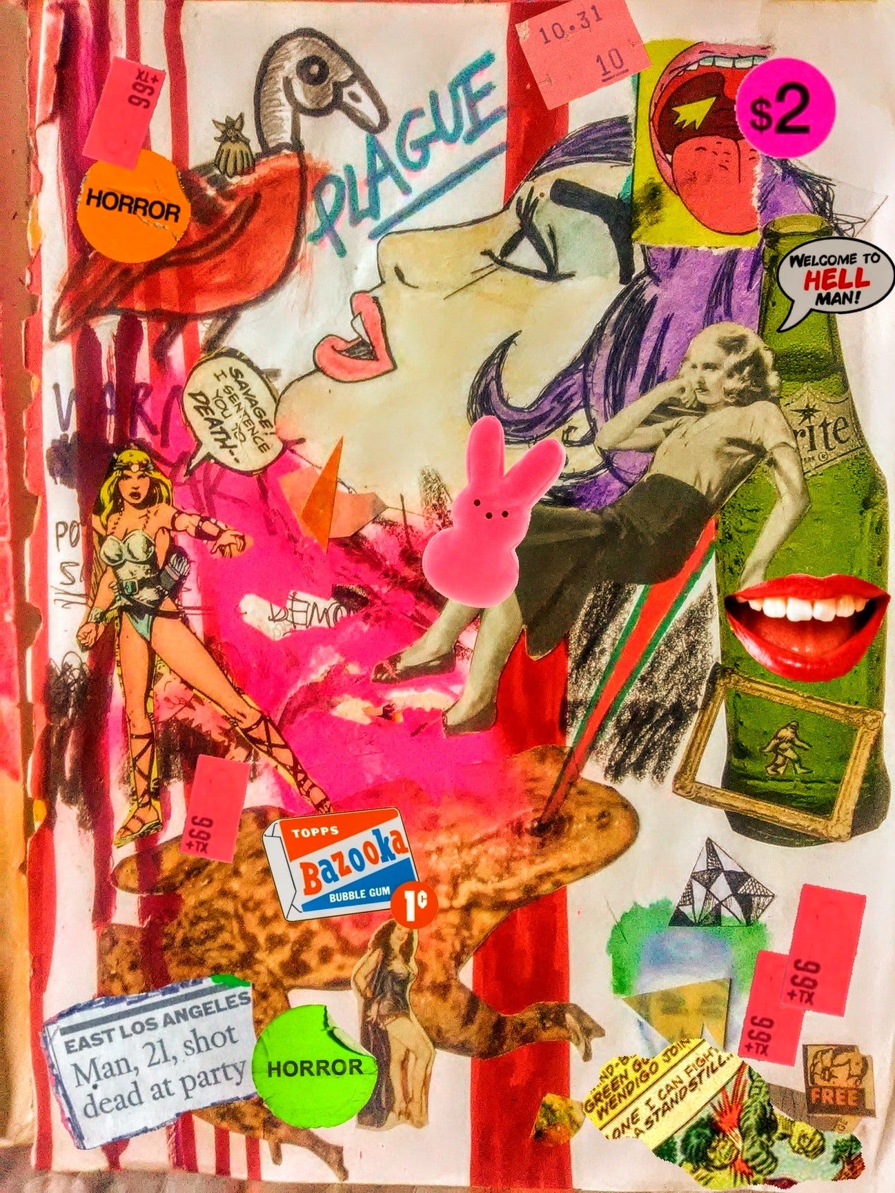 I had already slapped my contribution together in under a minute, cutting and pasting additions to an already tactile collage on my laptop while folding laundry, the glow of the screen flickering across an ashtray piled with cigarettes. It was barely a design, more like an uninterested middle-finger dressed up as art. But for a couple grand on a Saturday afternoon when I was hungover and hollow-eyed and the world felt like a busted amp, it was perfect.